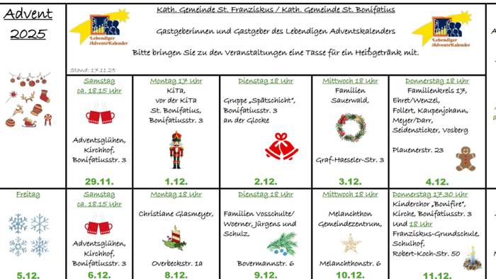 In diesem Jahr öffnet der „Lebendige Adventskalender“ wieder seine Türchen in unseren Gemeinden Sankt Franziskus und Sankt Bonifatius. Beim „Lebendigen Adventskalender“ treffen sich Menschen an den Tagen vor Weihnachten. Sie treffen sich vor Fenstern, Türen, Garagentoren oder Carports. Sie singen, hören Geschichten, es gibt Gebete, Lieder und zum Abschluss vielleicht ein heißes Getränk oder Gebäck. Ein Plan mit allen Gastgebenden der Abende liegt in den Kirchen aus und steht auf der Homepage. Herzliche Einladung zum Besuch der Abende an bekannten oder auch an unbekannten Orten.
