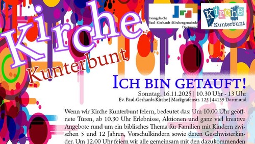 Heute feiern wir in der Kirche Kunterbunt eine Taufe; die Aktionen ab 10.30 Uhr richten sich an Familien mit kleineren Kindern. Zum Gottesdienst um 12 Uhr sind alle herzlich eingeladen, ebenso zum gemeinsamen Abschluss mit Mittagessen um 13 Uhr.