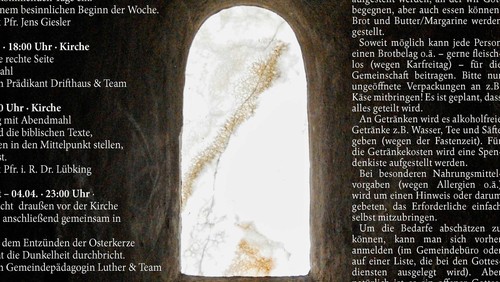 Wir beginnen die Osternacht draußen vor der Kirche am Osterfeuer und ziehen anschließend gemeinsam in die dunkle Kirche ein. Mit Lesungen, Musik und dem Entzünden der Osterkerze feiern wir, wie Gottes Licht die Dunkelheit durchbricht.
