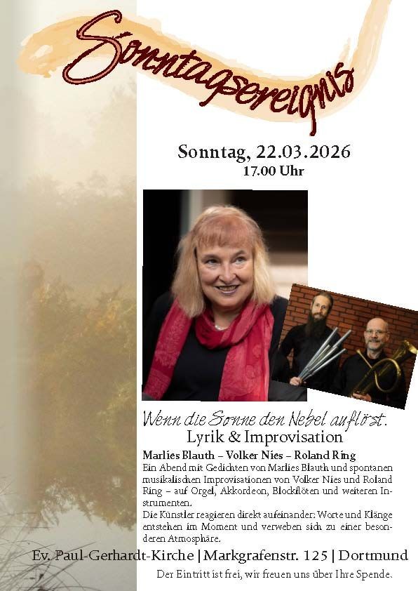 Ein Abend mit Gedichten von Marlies Blauth und spontanen musikalischen Improvisationen von Volker Nies und Roland Ring – auf Orgel, Akkordeon, Blockflöten und weiteren Instrumenten.