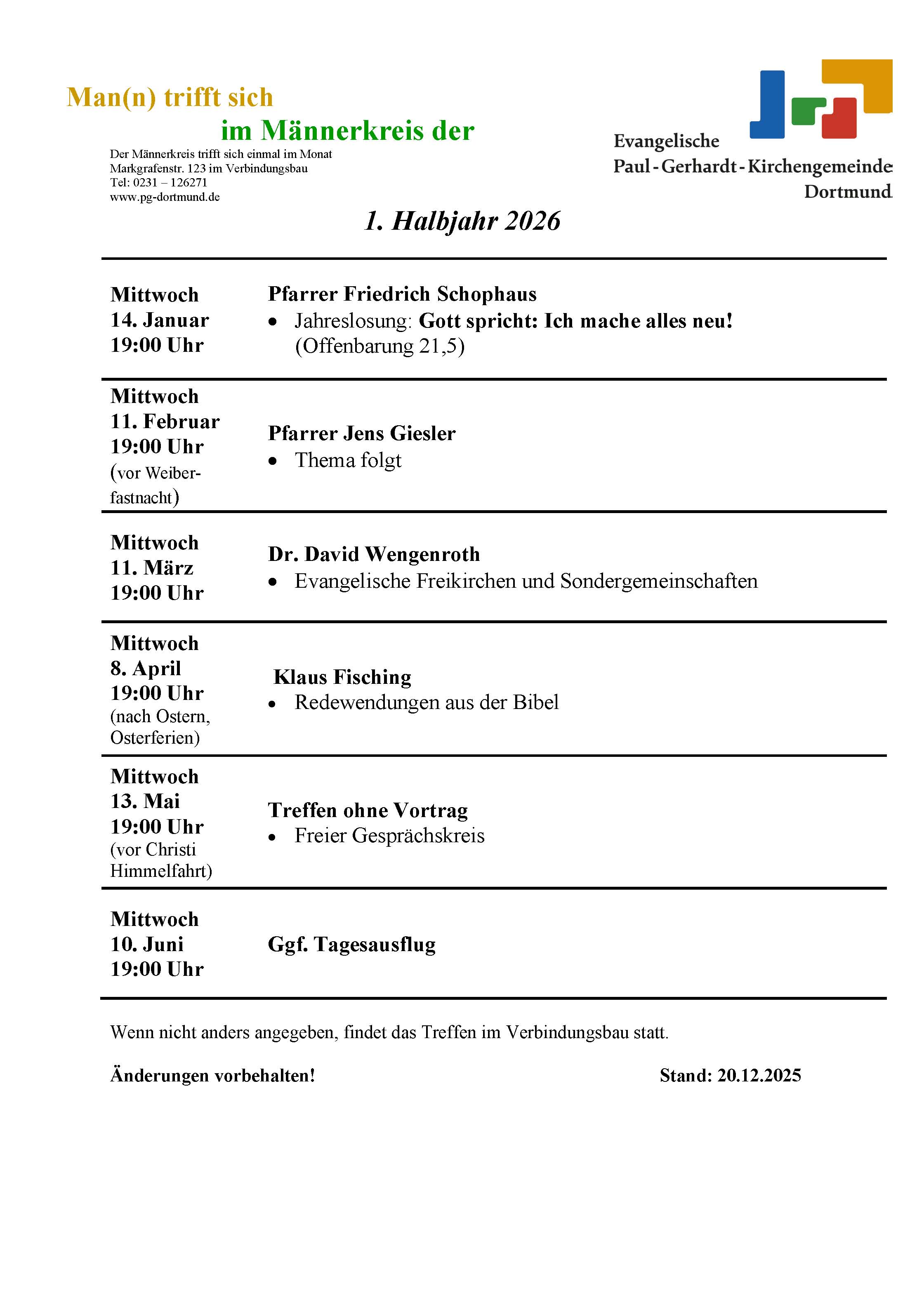 Der Männerkreis der Evangelischen Paul-Gerhardt-Kirchengemeinde findet einmal monatlich statt. Mit interessanten Aktivitäten, z. B. Besichtigungen, Grillabenden, Wochenend-Freizeiten sowie Vorträgen zu aktuellen Themen werden Männer willkommen geheißen.